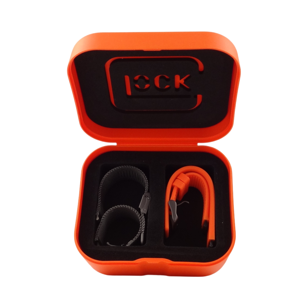 Lieferumfang: GLOCK Watch Global, Mesh- und Silikonband, Original GLOCK‑Case, Bedienungsanleitung.